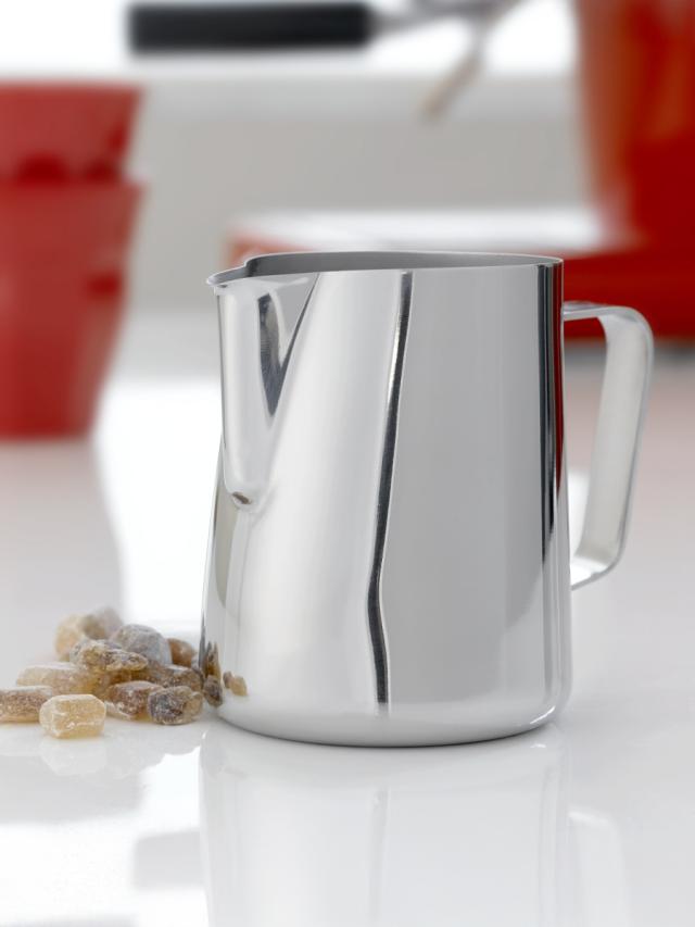 En mindre stål-kande, perfekt til mindre mælkedrikke. Den skarpe hældetud giver kontrol, når du hælder og former latte art.