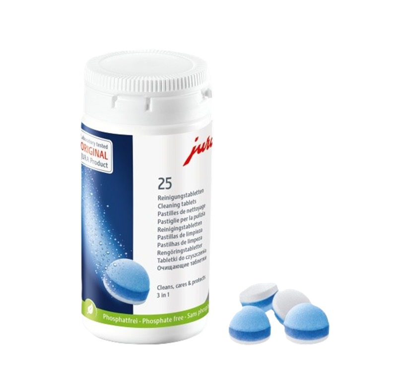 - Effektiv rengøring, pleje og beskyttelse – 3 i 1 En bøtte indeholder 25 rensetabletter. Alle JURA espressomaskiner bør renses efter ca. 200 kopper kaffe for at sikre optimal hygiejne og drift. Tabletterne arbejder i tre faser: Rens: Fjerner kaffefedt og partikler grundigt. Pleje: Lægger en beskyttende barriere, så rester ikke sætter sig fast. Beskyttelse: Forebygger kalkaflejringer og skåner maskinens komponenter. Med disse 3-i-1 tabletter får du en maskine, der holder sig ren, hygiejnisk og leverer velsmagende kaffe i lang tid. Samtidig forlænges maskinens levetid. JURA anbefaler altid brug af de originale rensetabletter, som er udviklet og afstemt præcist til maskinens rengøringsprogrammer.